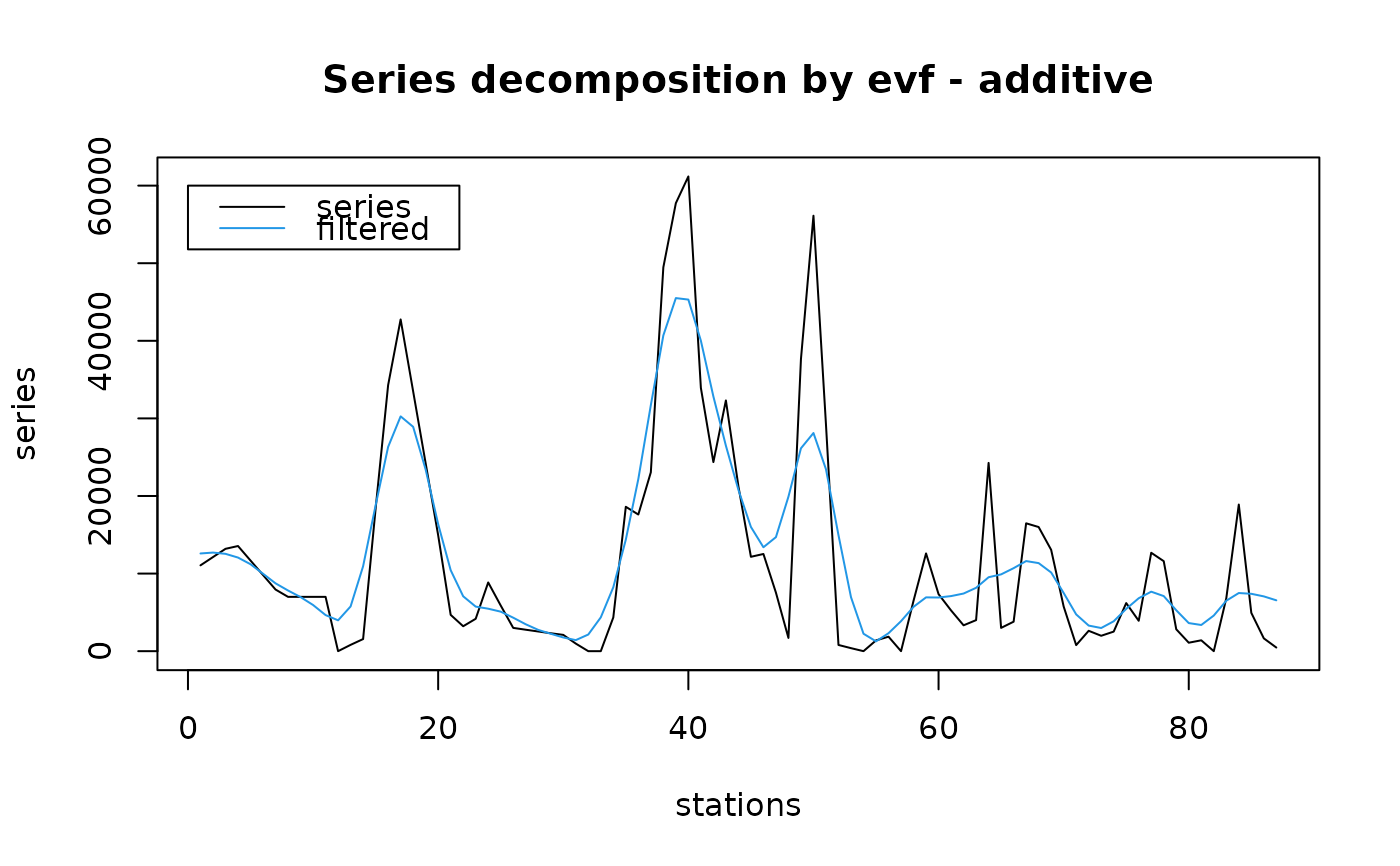 plot(melo.evf, col=c(1, 4), xlab="stations", stack=FALSE, resid=FALSE,