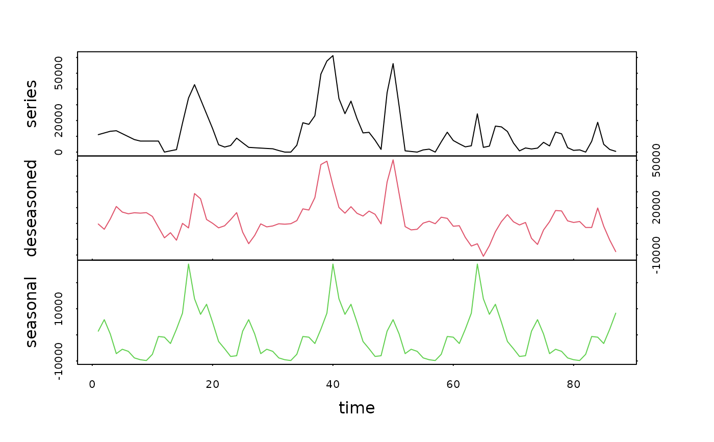 a trend is calculated (under R only). Otherwise, the series is decomposed into a seasonal component and residuals only