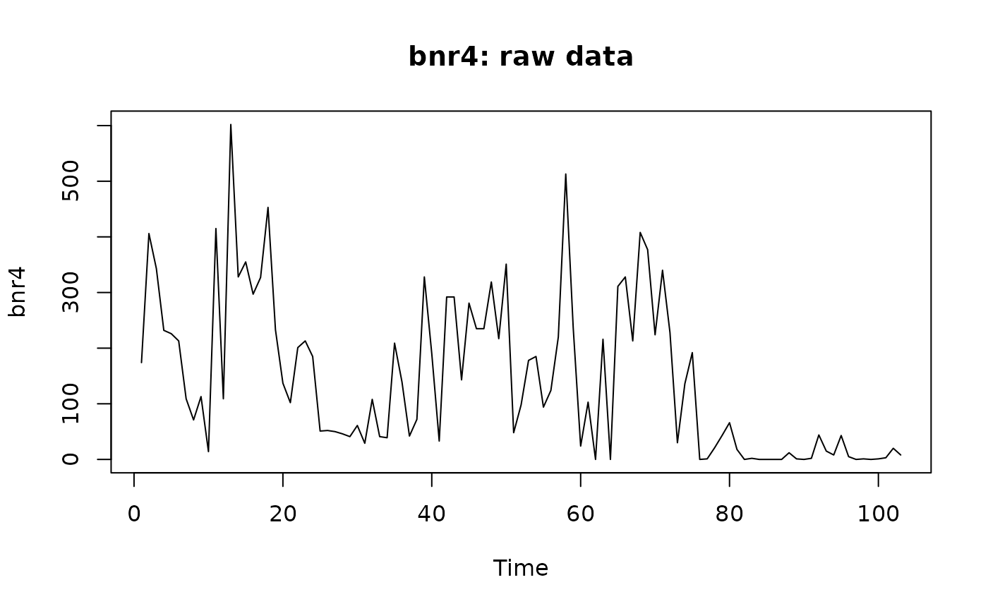 plot(bnr4, type="l", main="bnr4: raw data", xlab="Time")