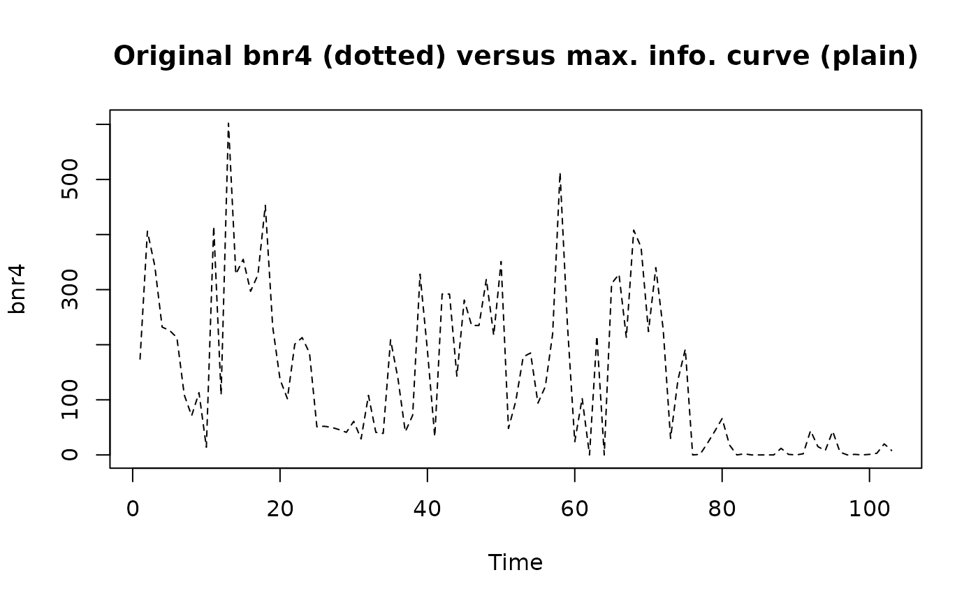 title("Original bnr4 (dotted) versus max. info. curve (plain)")