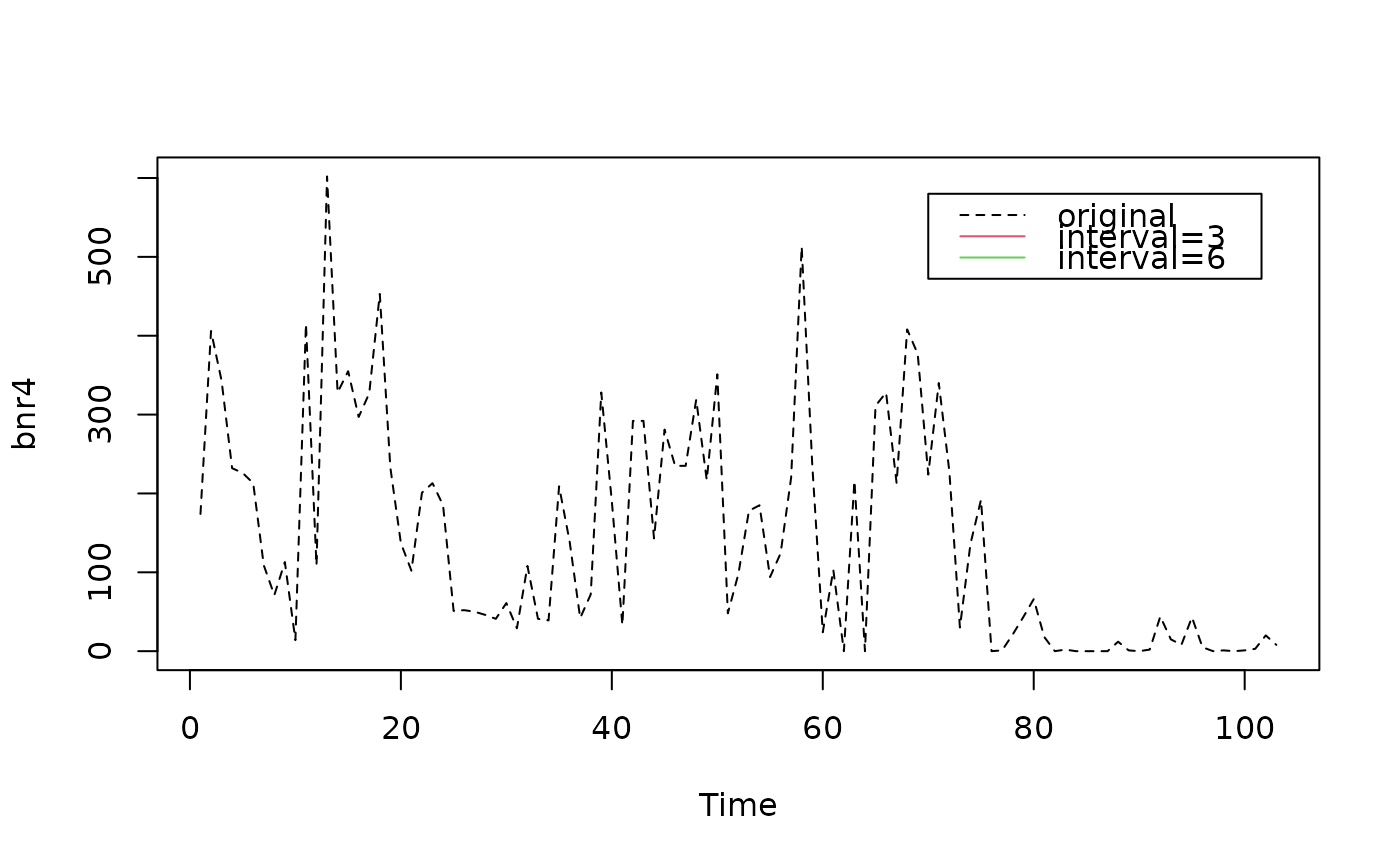 legend(70, 580, c("original", "interval=3", "interval=6"), col=1:3, lty=c(2, 1, 1))